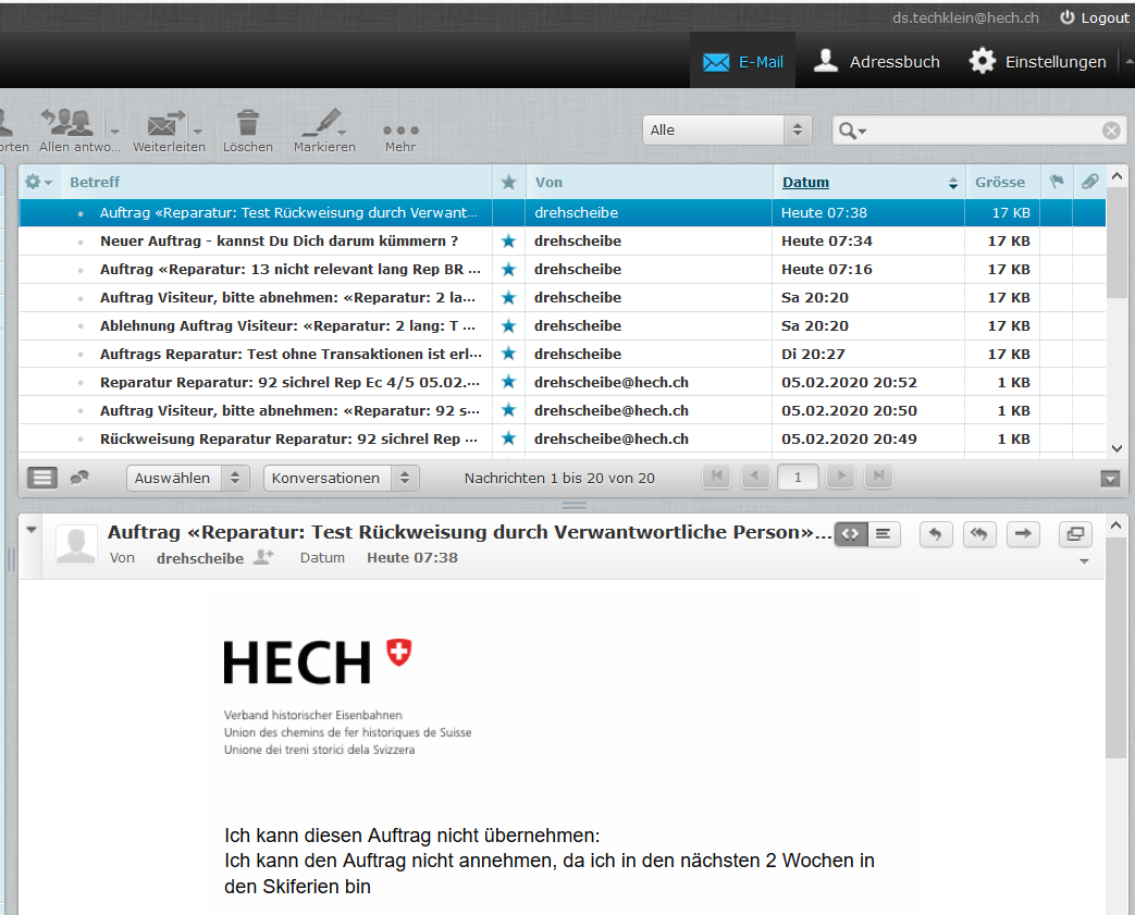 Dem Auftraggeber wird die Rückweisung mit einem E-Mail angezeigt