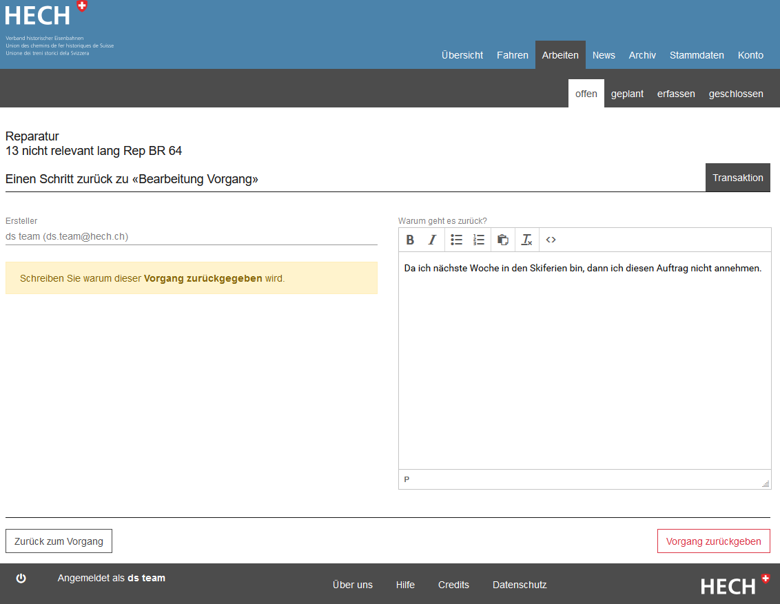 Erhält jemand einen RepZettel zur Bearbeitung, kann diese Person diesen Auftrag auch ablehnen - zurückgeben